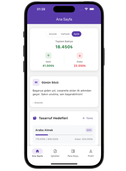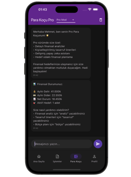 Kişisel Finans Koçu: Harcama alışkanlıklarını analiz eden yapay zeka destekli finans koçuyla daha doğru finansal kararlar al. Gereksiz harcamalardan kaçın ve birikimlerini artır.