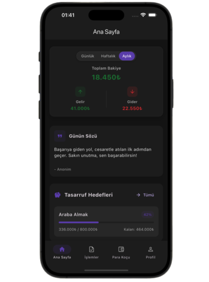 Karanlık Mod: Göz yormadan, modern ve şık bir arayüzle harcamalarını yönet. Gece gündüz rahatça finansal verilerini incele.